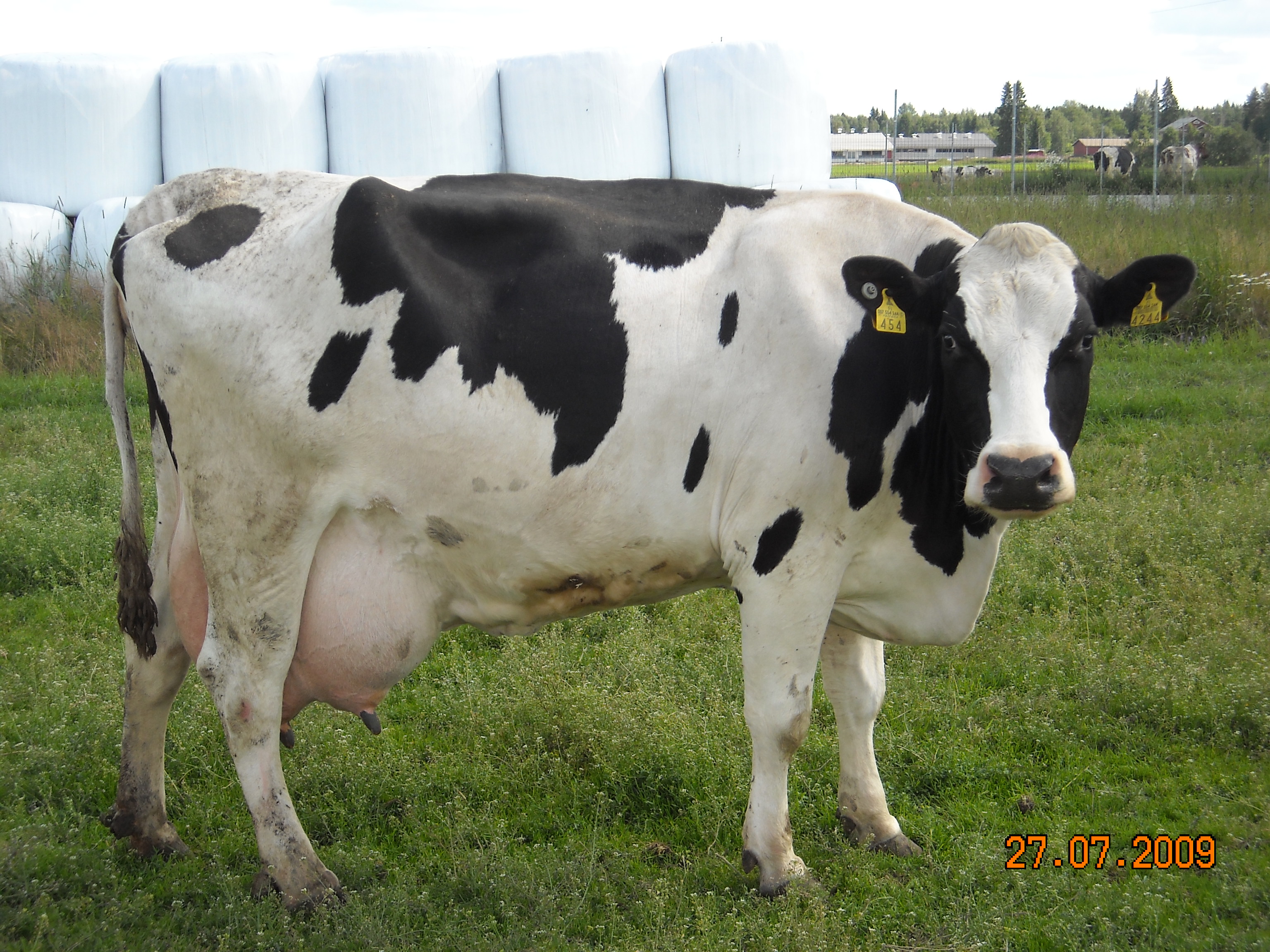Odotetaan poikivan / Due to calve: Poikimiset / Calvings: 1. 14.1.2007 sonni / bull calf Yty (Lucente FFF 93656) 2. 25.4.2008 sonni / bull calf (Romarin, Blonde d`aquitaine) 3. 16.6.2009 Essu (Passo, Blonde d`aquitaine) 4. 20.10.2010 sonni / bull calf Hamara (Onyx, Blonde d`aquitaine) Tuotokset / Production (305 days): 1. 8 037 (milk-kg) - 286 (fat-kg) - 3,56 - 275 (protein-kg) - 3,42 - 57 (somatic cell score) 2. 7 666 - 326 - 4,25 - 257 - 3,35 - 72 3. 7 367 - 273 - 3,71 - 253 - 3,43 - 59 NTM 2010.8: -11 AF-Class 11.6.2007: F 60 (82, 40, 65, 72) |