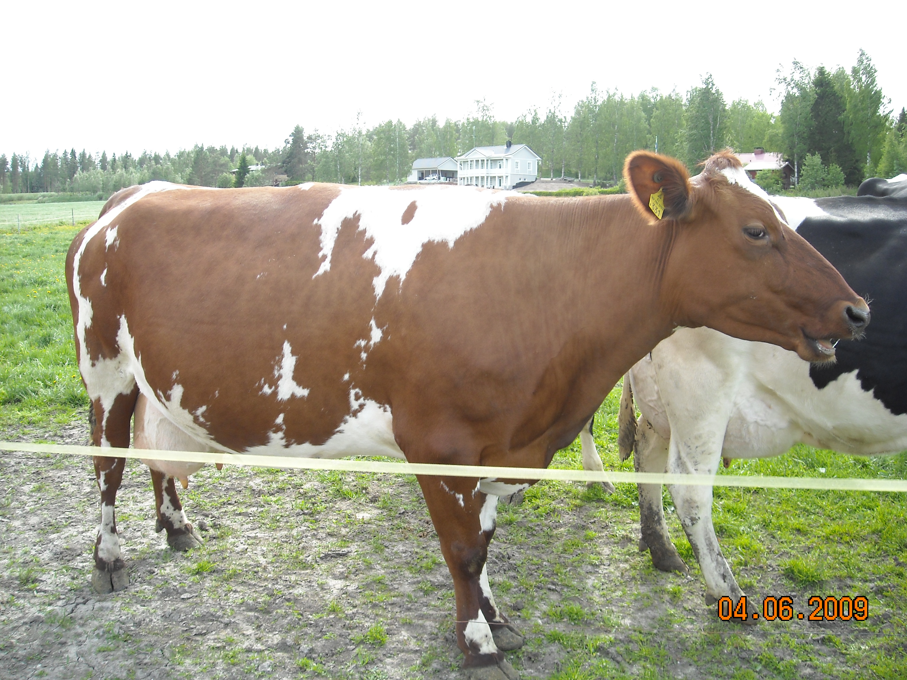 Sirja 3 kertaa poikineena. Sirjaa ei voida siementää enää emättimen esiinluiskahduksen takia. Harmi, koska Sirja on muuten ihan terve, lypsää ja rakennekin suht ok. Kasvattaja: Tommi Seppälä, Toholampi Ostettu 7.2.2008 2 kertaa poikineena. Syntynyt/Born: 16.10.2003 Emä/Dam: Pirjo (Koivuharjun Iekki AAA 40035) Isä/Sire: Pukaralammin Polo A 41753 Poikimiset/Calvings: 1. 25.10.2005 2. 2.10.2006 3. 21.2.2008 sonni / bull calf Alpo (Teristen Odeion, Hereford) Tuotokset/Production (305 days): 1. 7 864 (milk-kg) - 302 (fat-kg) - 3,84 - 262 (protein-kg) - 3,33 - 63 (somatic cell score) 2. 9 817 - 440 - 4,48 - 361 - 3,68 - 71 3. 9 590 - 439 - 4,58 - 325 - 3,39 - 114 NTM 2009.5: -2 AF-class 12.3.2008: F 60 (65, 40, 55, 65) Elinikäistuotos kesäkuussa 2009 / Lifetime production in June 2009: 34 285 kg |