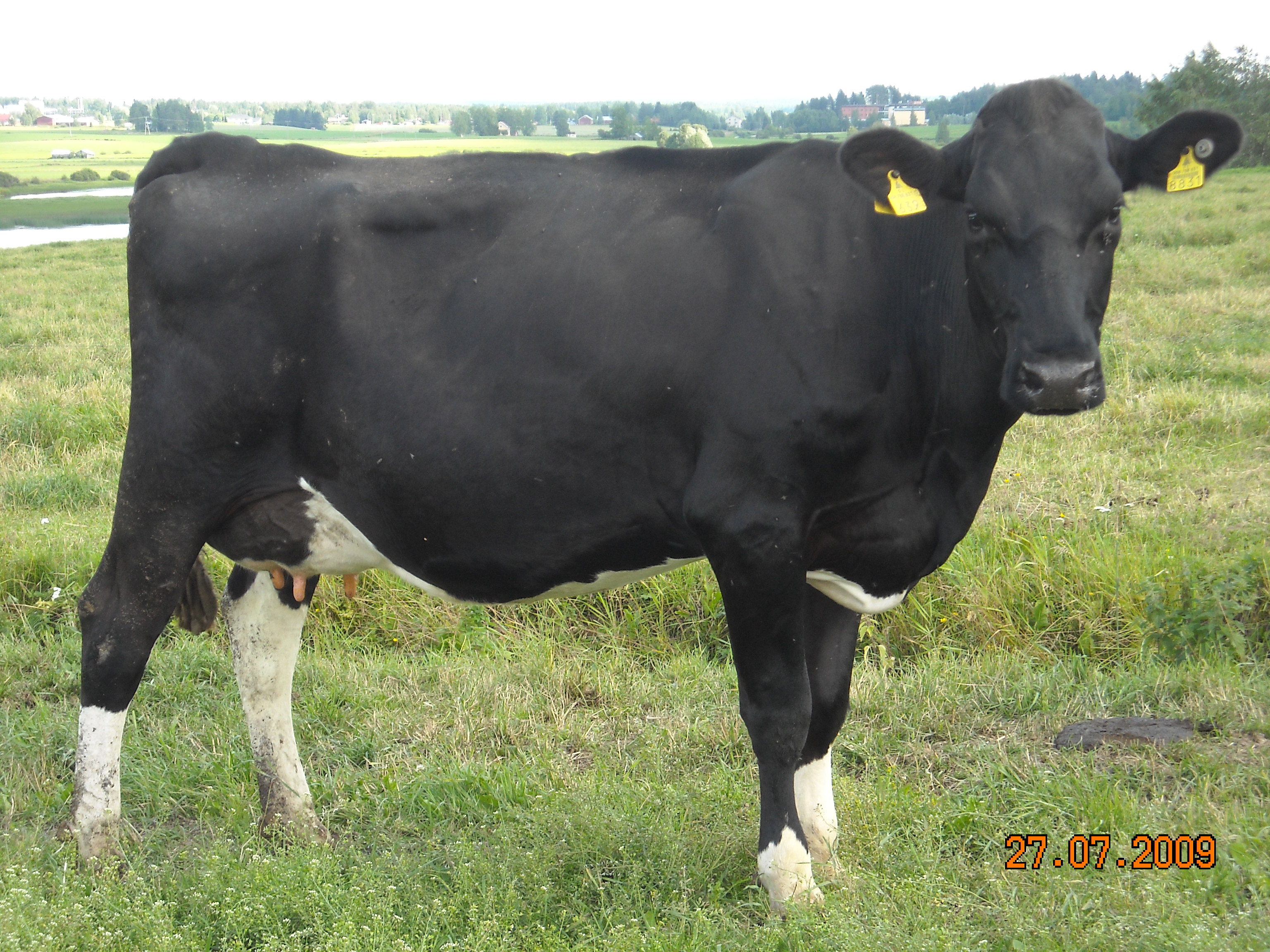 Odotetaan poikivan / Due to calve: Poikimiset / Calvings: 1. 2.4.2009 R-S Epsilon (Buckeye FFF 94134) 2. 27.7.2010 R-S. Hepsilon (Ramos FFF 93616) 3. 18.7.2011 sonni / bull calf Tuotokset / Production (305 days): 1. 9 615 (milk-kg) - 384 (fat-kg) - 3,99 - 311 (protein-kg) - 3,23 - 30 (somatic cell score) 2. 12 289 - 498 - 4,05 - 409 - 3,33 - 138 Hollantilainen luokitus 17.6.2009: GP82 (Runko 78, Lypsytyyppi 78, Utare 86, Jalat 81) |